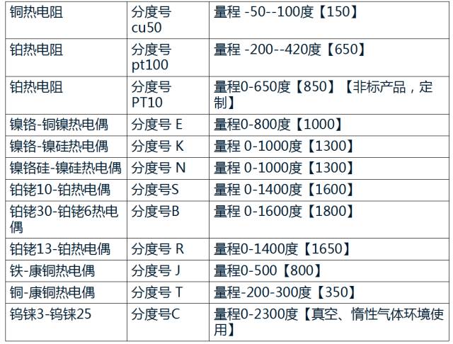 工作中的现场判断. 1.热电偶. 热电偶有正负极,补偿导线也有正负之分.首先保证连接,配置确.在运行中,常见的有短路,断路,接触不良(有万用表可判断)和变质(根据表面颜色来鉴别).检查时,要使热电偶与二次表分开。 2.热电阻.不外乎短路,和断路.用万用表可判断.在运行中.怀疑短路,只要将电阻端拆下一个线头,看显示仪表,如到******,热电阻短路.回零,导线短路.保证正常连接和配置时,表值显示低或不稳,保护管可能性进水了.显示******,热电阻断路.显示最小,短路 热电偶和热电阻的选择: 热电偶的分度号有主要有S、R、B、N、K、E、J、T等几种。其中S、R、B属于贵金属热电偶,N、K、E、J、T属于廉金属热电偶。 T分度号的特点是在所有廉金属热电偶中精确度等级最高,通常用来测量300℃以下的温度。 热电阻是中低温区最常用的一种温度检测器。它的主要特点是测量精度高,性能稳定。其中铂热电阻的测量精确度是最高的,它不仅广泛应用于工业测温,而且被制成标准的基准仪。热电阻大都由纯金属材料制成,目前应用最多的是铂和铜,此外,现在已开始采用镍、锰和铑等材料制造热电阻。