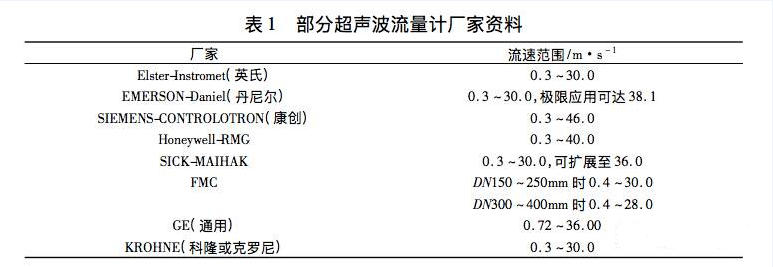 中国石油天然气管道工程有限公司拟定的 CDP-G-GP-IS-003-2009 /B《输气管道计量系统设计规定》指出,在选择计量管路和流量计内径时,超声波流量计按流速 20. 0m/s 进行初始计算,口径圆整后复核设计流速宜在20.0~22.0m/s范围内。附录 C 中规定,超声波流量计的天然气流速 按照22.0m/s计算,天然气计量系统的设计能力为其******能力的 75% ~ 85% ( ******能力为供货商提供的流量计的******量程) 。这与中石油西气东输工程中规定的,超声波计量管流速设计上限不宜超过25.0m/s是一致的。 表 1 的资料来源于厂家公开样本和用户技术 报告,其统计内容仅限于用于天然气计量的、精度不大于 ± 0. 5% 的产品。综合考虑标准规范要求 和生产厂家的技术能力与应用经验,发现工程实践中超声波计量管流速设计上限不宜超过 25.0m/s是合理的。
